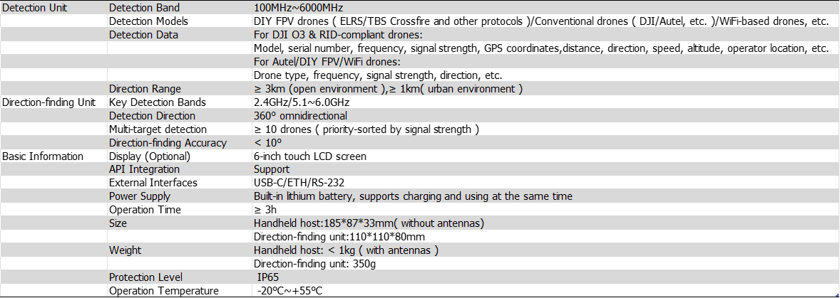 เครื่องตรวจจับนี้ออกแบบมาสำหรับปฏิบัติการรบแบบบุคคล ใช้เทคโนโลยีการตรวจจับแบบ Passive เพื่อการตรวจสอบ ระบุ และแจ้งเตือนแบบเรียลไทม์ 360 องศา ทั้งโดรน FPV แบบ DIY และโดรนทั่วไป มาพร้อมระบบค้นหาทิศทางการเปรียบเทียบเฟสความแม่นยำสูง เพียงชุดเดียวก็สามารถระบุทิศทางของโดรนได้ การออกแบบแบบแยกส่วนประกอบด้วยชุดตรวจจับแบบพกพาพร้อมหน้าจอสัมผัสขนาด 6.5 นิ้ว (แสดงรายละเอียดเป้าหมาย ตำแหน่งผู้ปฏิบัติงาน แผนที่ออฟไลน์ และการเล่นซ้ำเส้นทางการบิน) และโมดูลค้นหาทิศทางที่ติดตั้งบนหมวกนิรภัย ช่วยให้มั่นใจได้ถึงความสามารถในการปรับตัวในสนามรบอย่างมีประสิทธิภาพสูงสุด เหมาะอย่างยิ่งสำหรับปฏิบัติการทางทหาร การลาดตระเวนชายแดน และการป้องกันพื้นที่สำคัญ