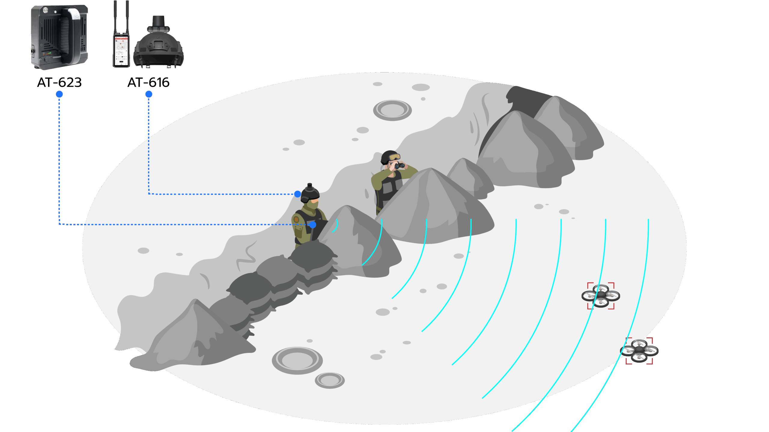 อุปกรณ์ AT-616 ช่วยให้สามารถตรวจจับ ระบุตัวตน และค้นหาได้รอบทิศทางแบบ 360 องศา ทั้งโดรนทั่วไปและโดรน FPV ในขณะเดียวกันอุปกรณ์  AT-623 สามารถส่งสัญญาณรบกวนเพื่อรบกวนการเชื่อมต่อการควบคุมระยะไกลของโดรน FPV อย่างรวดเร็ว ทำให้สูญเสียการควบคุมและตก อุปกรณ์ทั้งสองทำงานร่วมกันอย่างมีประสิทธิภาพ น้ำหนักเบา ใช้งานง่าย ประสิทธิภาพสูง สามารถปกป้องชีวิตของทหารได้อย่างมีประสิทธิภาพ (AT-616 + AT-623)