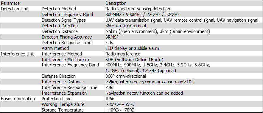 ระบบต่อต้านอากาศยานไร้คนขับที่ติดตั้งบนยานพาหนะนี้ รวมการตรวจจับ การระบุฝ่าย การรบกวน และการส่งสัญญาณปลอม ไว้ในอุปกรณ์หน่วยขนาดกะทัดรัด สามารถติดตั้งบนยานพาหนะ โดยไม่ต้องดัดแปลงใดๆ ตอบโต้โดรนแบบรอบทิศทาง พร้อมความคล่องตัวสูง ป้องกันขณะเคลื่อนที่ ด้วยระบบรบกวนที่ใช้พลังงานต่ำ/ประสิทธิภาพสูงแบบ SDR จึงมั่นใจได้ถึงประสิทธิภาพการปฏิบัติการในระยะยาว